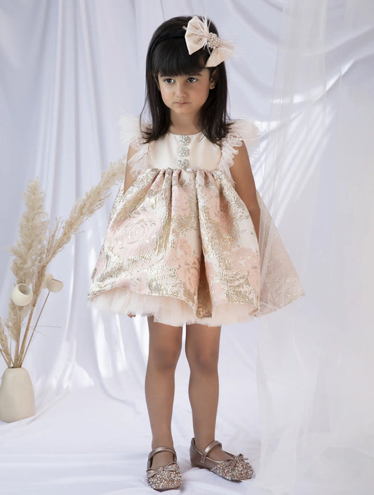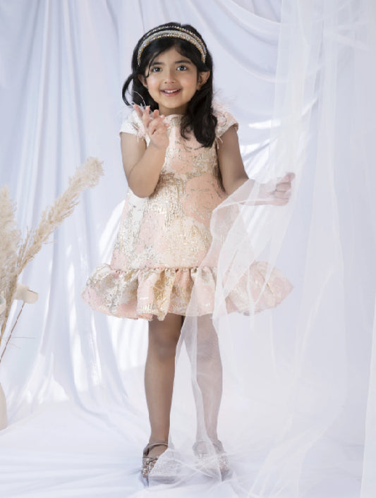 Blush Peach Jacquard Party Dress | Rhinestones & Feather Details