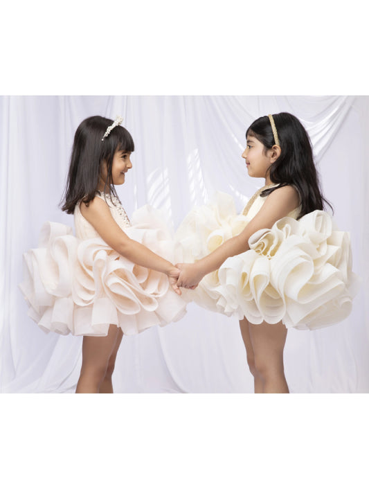 Blush Peach Ruffle Jacquard Dress with Feather Details | Celebration of Grace and Craftsmanship