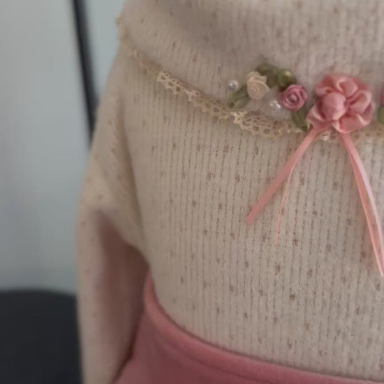 Haut doux de couleur crème associé à une jupe fluide couleur pêche, ornée de dentelle délicate et de détails floraux pour un look hivernal chic et élégant.