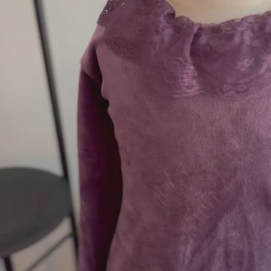 Le haut violet avec dentelle est un haut en tricot confortable qui équilibre parfaitement sophistication et espièglerie. La riche couleur violette ajoute une touche vibrante, tandis que la dentelle délicate et les détails floraux apportent un charme élégant au design. Ce haut élégant est le complément parfait à toute garde-robe d'hiver, offrant à la fois confort et look raffiné.