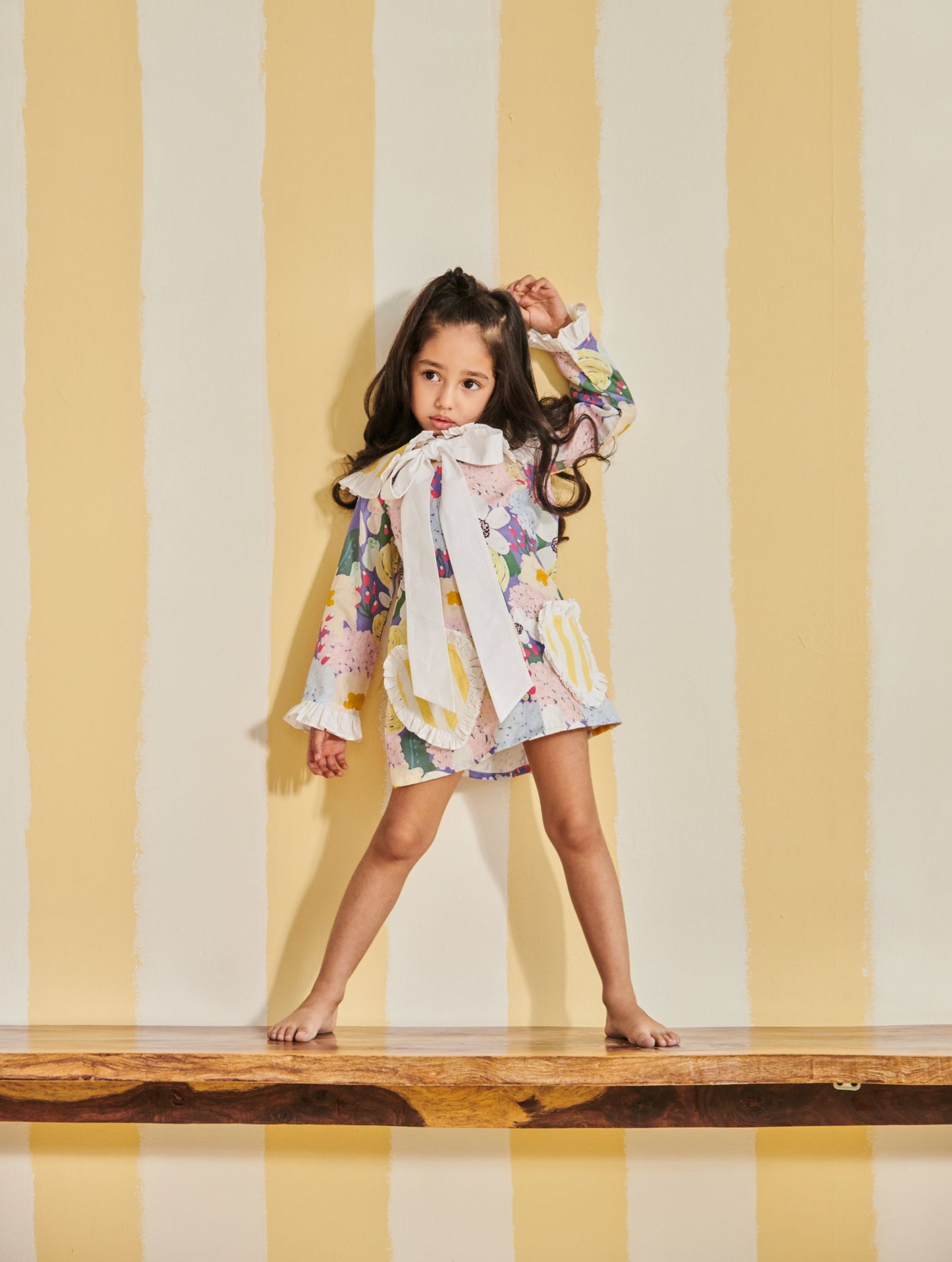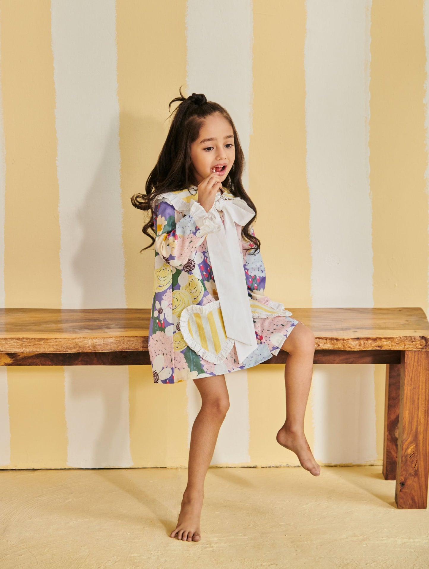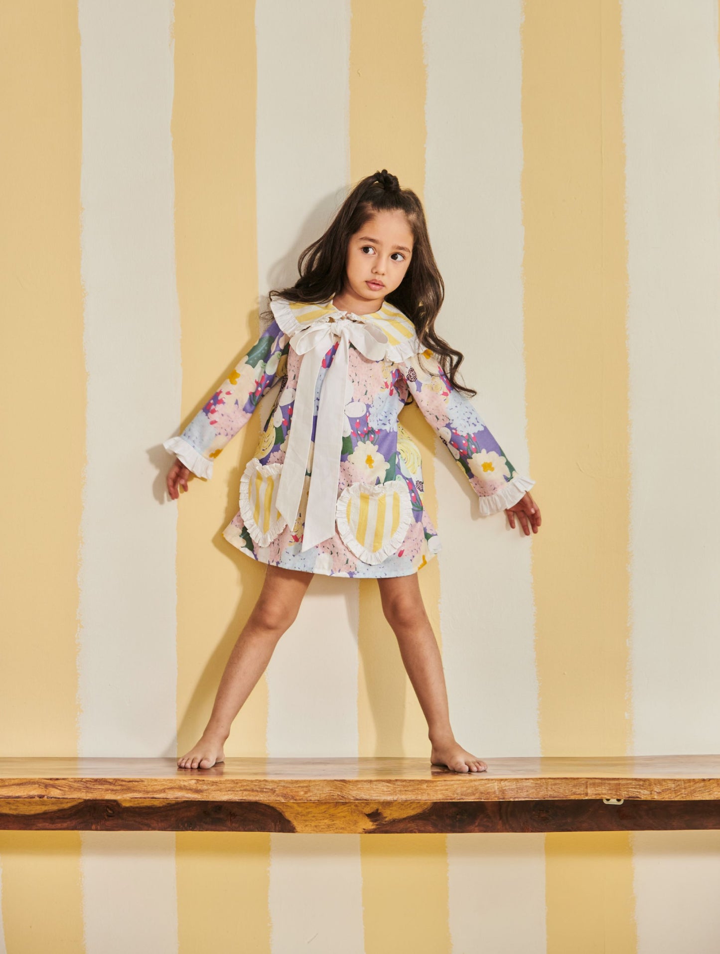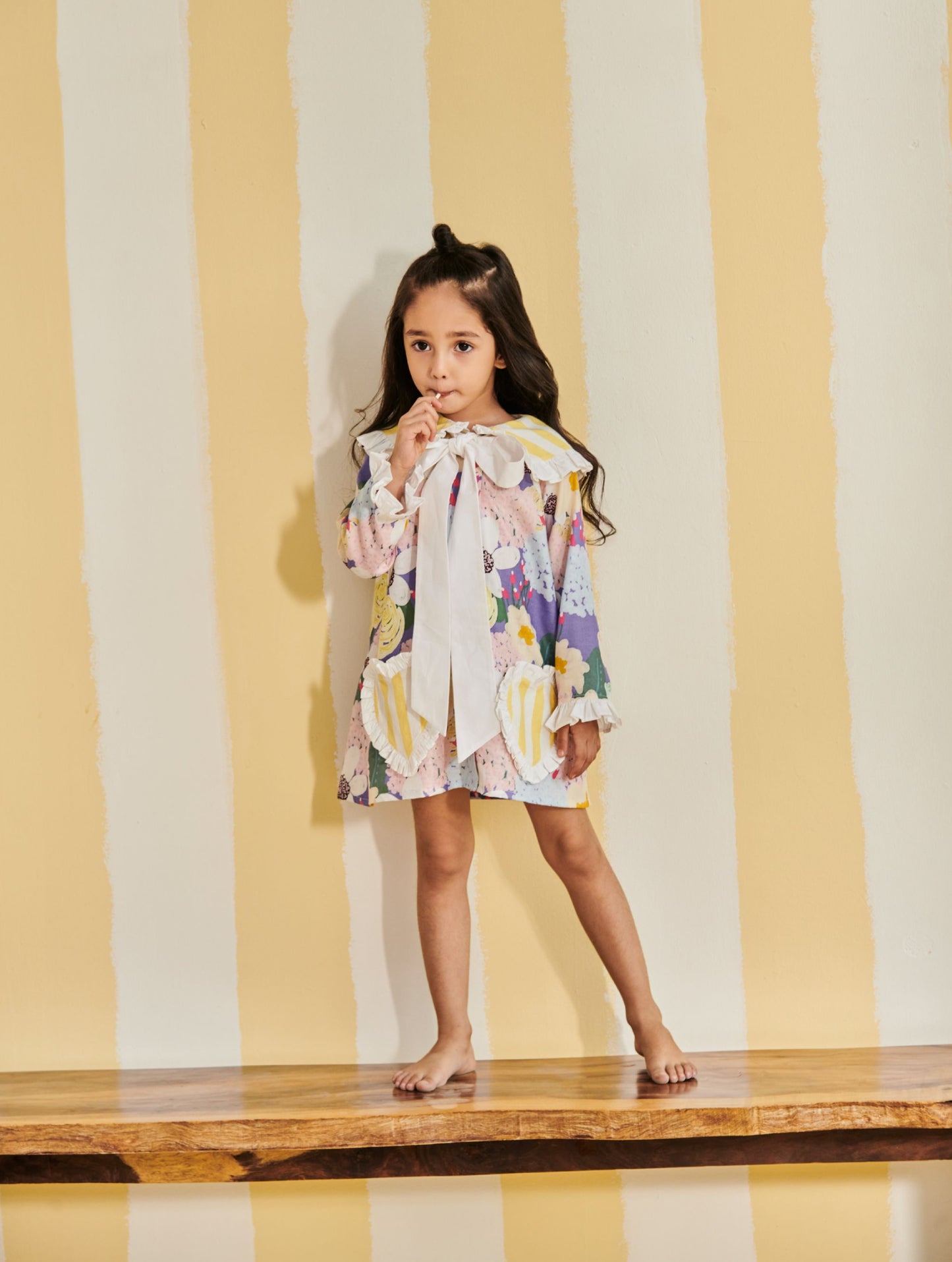 This dress is made of high-quality cotton fabric, ensuring a comfortable and durable wear. The printed design adds a playful touch to the overall look, and the included tie allows for versatile styling options.